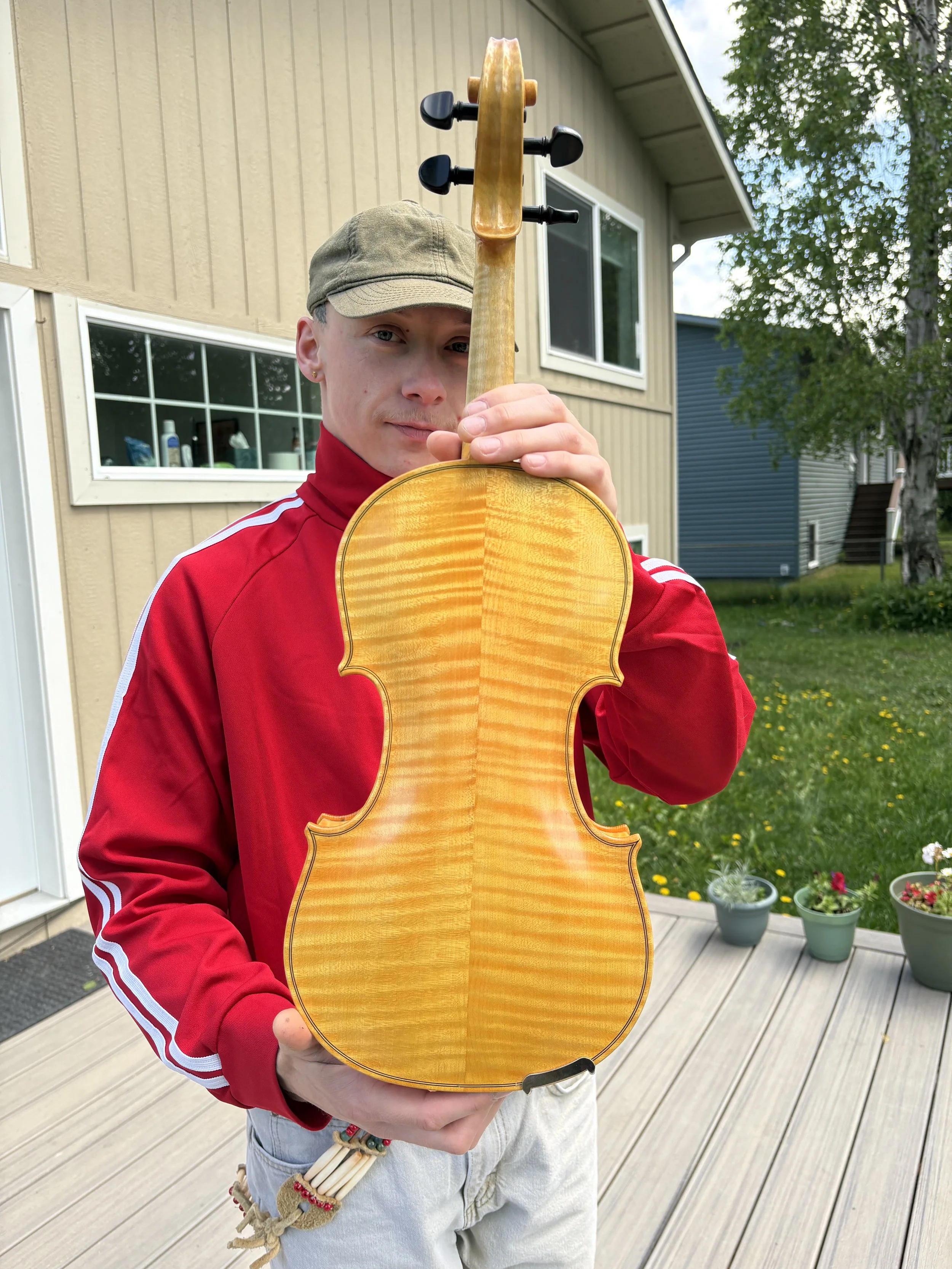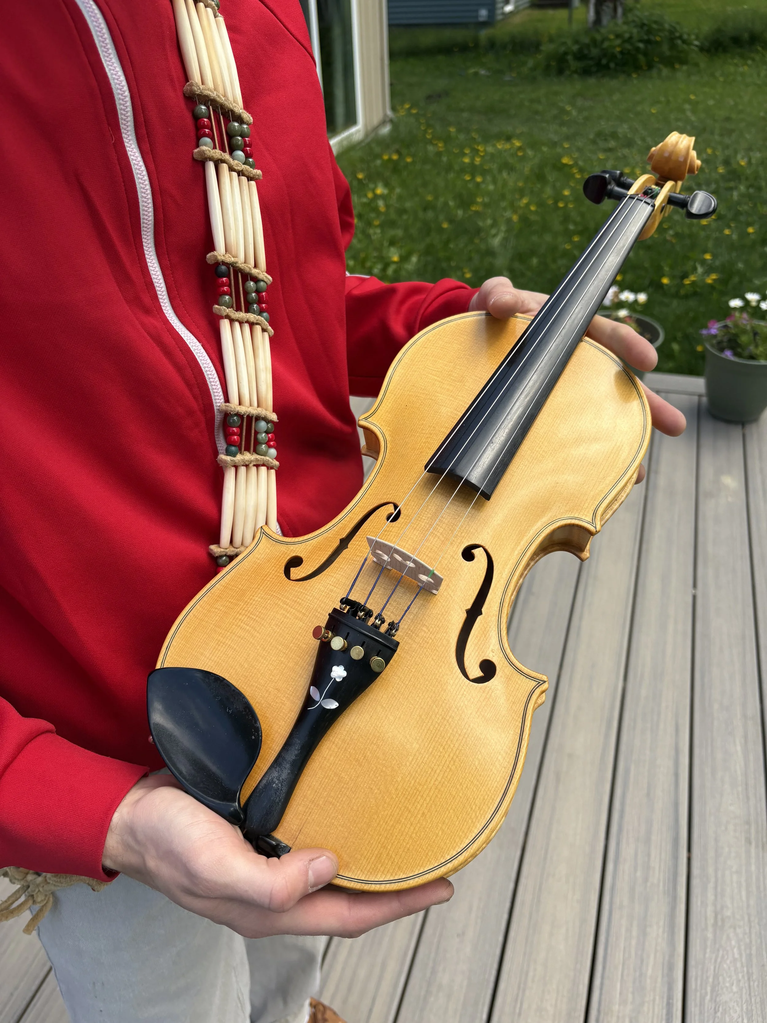 Quinn wrote a song titled, “Memory” that reflects on gifts passed down by his great-grandfather Frank Hobson, a luthier. Though he created roughly 60 violins that are coveted by collectors and are hard to find, the family didn’t own a Frank Hobson instrument. Quinn hadn’t even seen one and learned that one of the Hobson violins would be featured at an auction. “My whole table of these really powerful Native women,” Quinn said, “they made sure I won the violin. I won the most beautiful birch violin with my great grandfather’s handwriting inside,” he said.